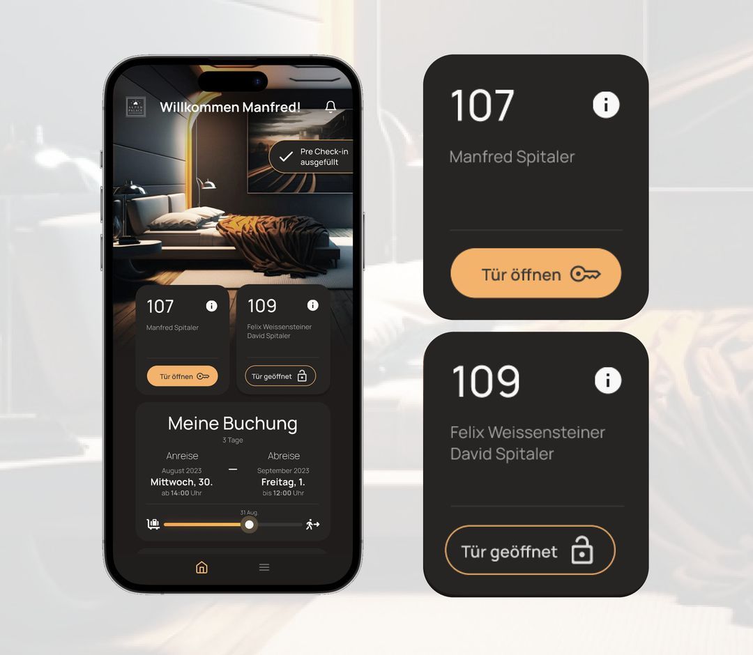 Coming Soon: Je nach dem Schlüsselsystem des Hotels kann über unsere die Gäste App auch ein mobiler Zimmerschlüssel erstellt werden. Dies ermöglicht einen vollständig kontaktlosen Self-Check-in, bei dem der Gast direkt von der Web-App aus Zugang zu seinem Zimmer erhält.