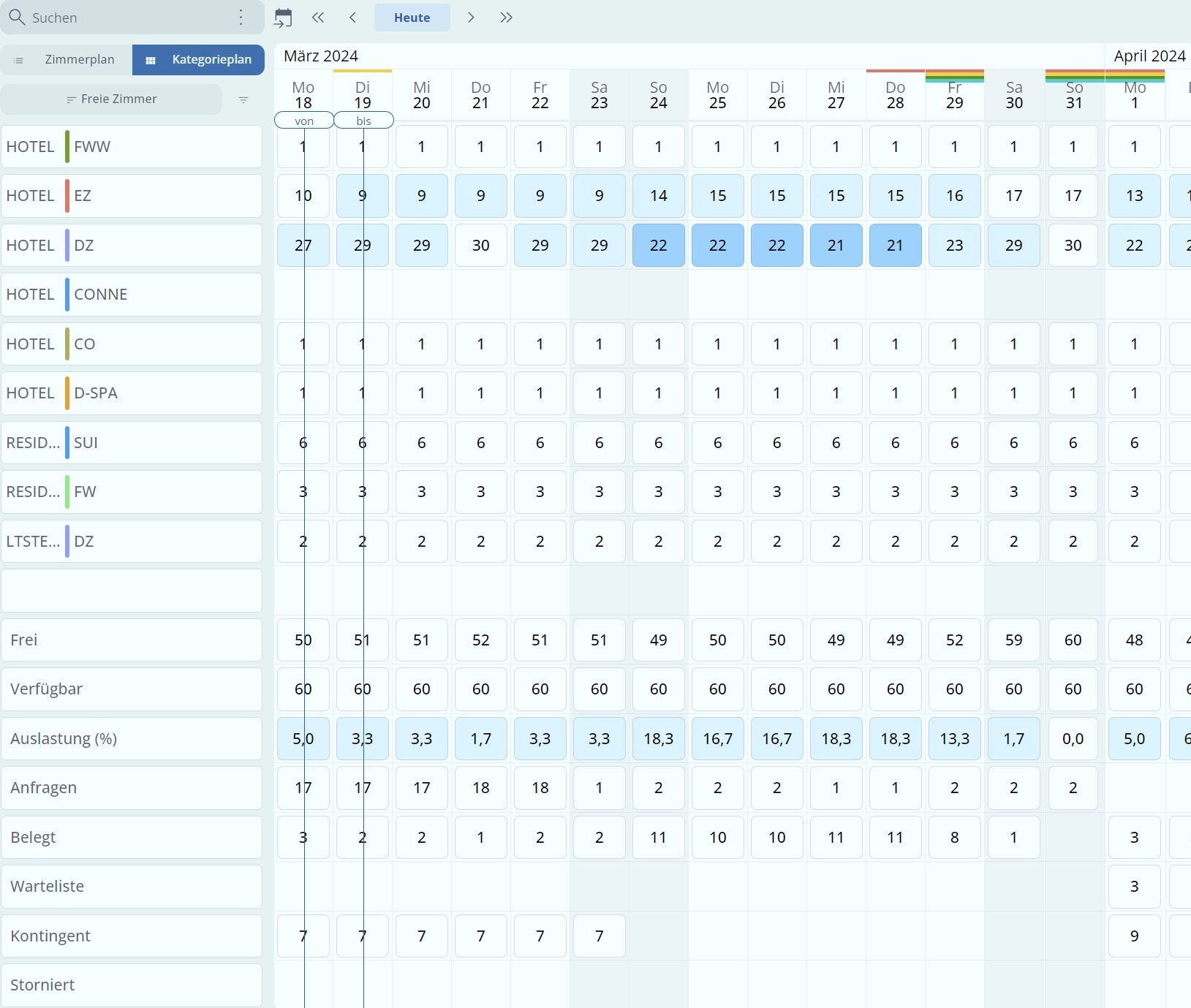 Für alle, die nicht mit dem Zimmerplan, sondern kategoriebasiert arbeiten: Im Kategorieplan werden die Summen der freien Zimmer pro Kategorie und Tag aufgelistet. Diese werden je nach Auslastung farblich gekennzeichnet. Der untere Bereich des Kategorieplans beinhaltet verschiedene wichtige Kennzahlen pro Tag, die für die tägliche Verwaltung unverzichtbar sind.