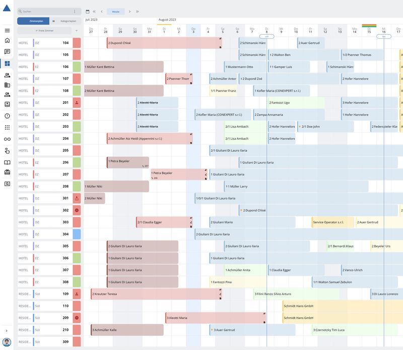 Der Zimmerplan ist das Kernstück der Hotelverwaltung. Er ermöglicht einen komfortablen Zugriff auf alle gästerelevanten Daten und Prozesse wie neue Online-Buchungen, offene Aufgaben, Check-in und -outs, etc.